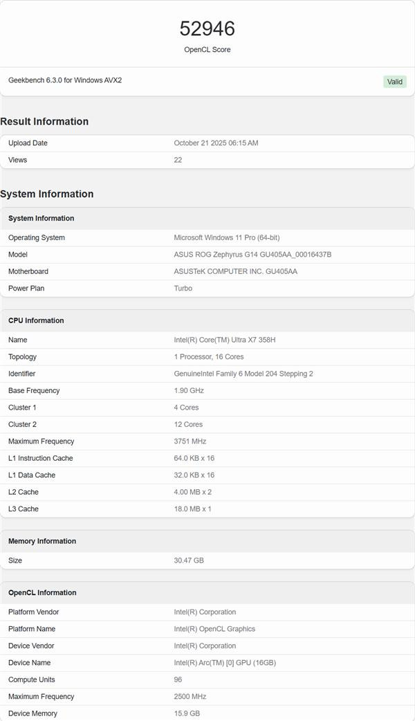 在Geekbench的OpenCL跑分中,酷睿Ultra X7 358H记录了两个分数:52946分和46841分,应该是对应了不同的功耗模式或电源计划。