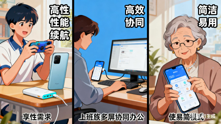 不同人群需求不同,无需追求全能旗舰,精准匹配更省钱。学生党遵循“性能顶+内存够+续航稳”原则,处理器选骁龙8 Gen2/天玑9300,搭配12+256G和5000mAh电池,能流畅玩大型游戏,撑满全天课程,2000-3000元档机型即可满足。上班族侧重快充或长续航,搭配护眼屏和多屏协同功能,办公传文件更高效,兼顾日常使用需求。