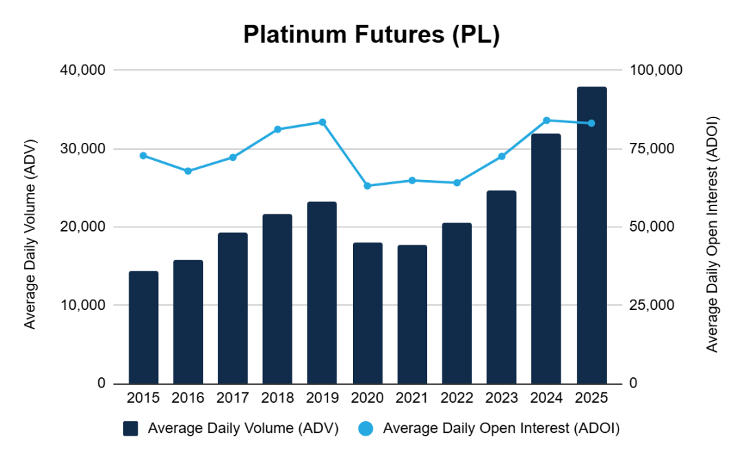 在需求的驱动下,铂金的投资价值更吸引,因此芝商所旗下的铂金期货合约也创下近3.8万份合约的日均交易量年度最高记录(见下图)。其未平仓合约数量超过 10 万份,这是自 2024 年 12 月以来的最高水平。