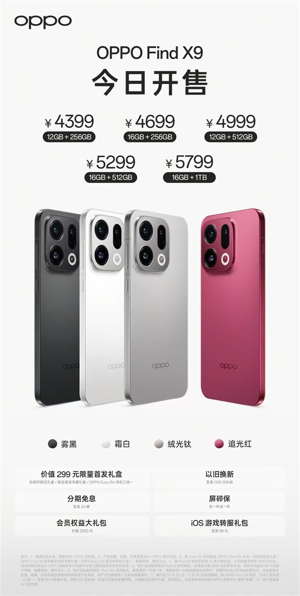 快科技10月22日消息,OPPO宣布Find X9系列正式发售,标准版起售价是4399元,Pro版起售价是5299元。与此同时,OPPO Pad5、OPPO Watch S同步开售,售价分别是2799元(8GB+256GB)、1299元。