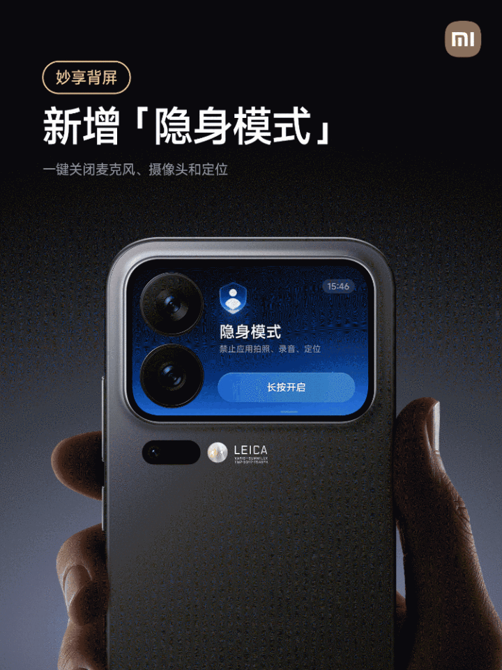 今天小米手机宣布,小米17 Pro系列新增一个【隐身模式】,就是在背屏添加一个功能卡片,点击可以一键关闭麦克风、摄像头及定位权限,保护隐私,禁止应用拍照、录音、定位等,适合在开会场景下使用,而且借助外屏,可以更加方便的操作,预计在11月中旬全量推送完成。
