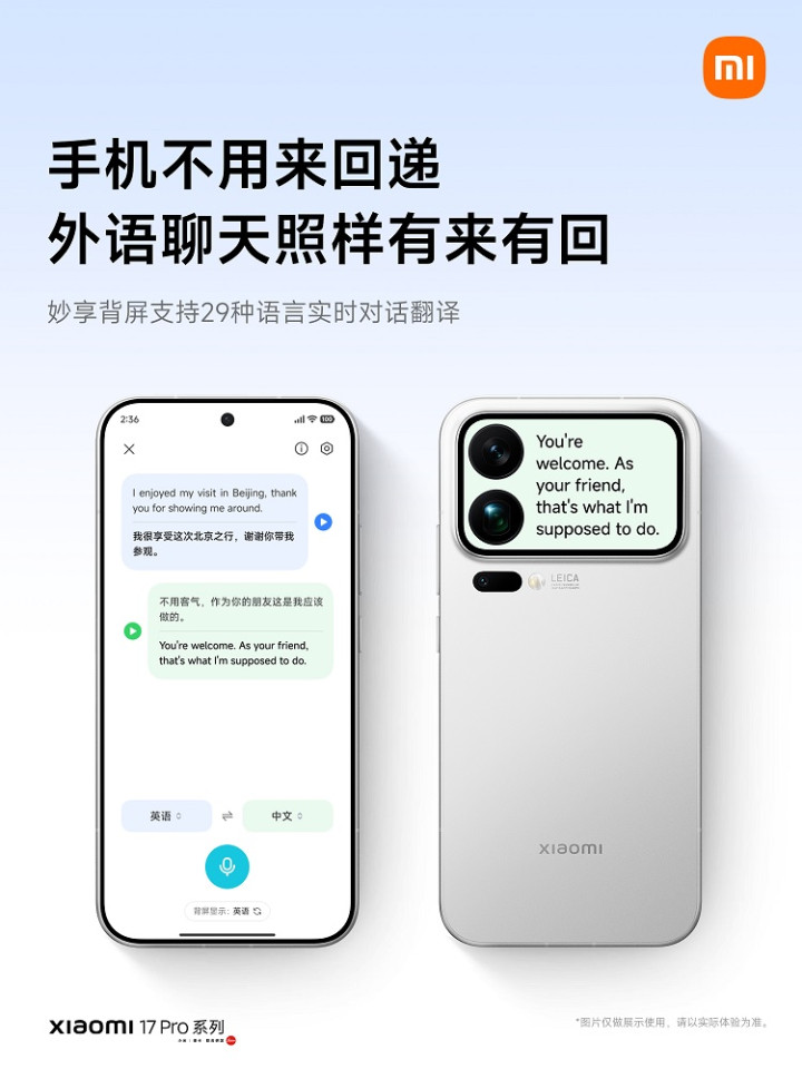 借助这个副屏,小米有许多巧思的设计,比如,之前小米17 Pro系列还新增了一个【对话翻译】功能,在正面说中文,背屏就可以直接显示翻译内容,也是一个背屏的很好用法。