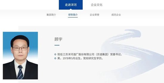 7月1日,洋河股份官网显示,顾宇已出任江苏洋河酒厂股份有限公司(苏酒集团)党委书记。公开资料显示,顾宇,1978年5月出生,汉族,党校研究生学历,中共党员,此前任宿迁市宿城区委副书记、区长、区政府党组书记。